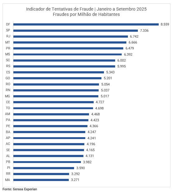 Na análise proporcional à população, o Distrito Federal aparece no topo do ranking nacional, com 8.559 tentativas de fraude a cada milhão de habitantes no acumulado de janeiro a setembro de 2025. Em seguida, destacam-se São Paulo (7.336), Rio de Janeiro (6.742) e Mato Grosso (6.666) nesse mesmo recorte. Na outra ponta do ranking estão o Piauí, com 3.590 tentativas por milhão de habitantes, Roraima, com 3.292, e, por fim, o Maranhão, com 3.271. Confira abaixo um gráfico que detalha os números da média dos registros por milhão em cada UF: