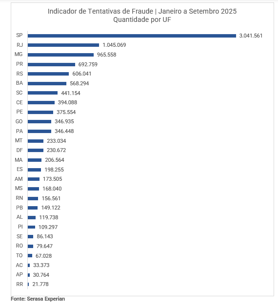 De janeiro a setembro de 2025, o Sudeste respondeu por 5,2 milhões de tentativas de fraude, o equivalente a 48,2% do total mapeado no período, mantendo-se como a região mais visada do país. Em seguida aparecem o Nordeste, com cerca de 2,1 milhões de ocorrências, e o Sul, com 1,7 milhão. Já Centro-Oeste e Norte somaram juntas aproximadamente 1,7 milhão de tentativas. Veja no gráfico abaixo o total de cada região do país e o ranking individual por Unidades Federativas (UFs):