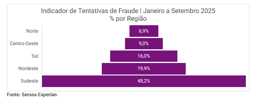 A região Sul registrou 1.739.954 tentativas de fraude entre janeiro e setembro de 2025, segundo o Indicador de Tentativas de Fraude da Serasa Experian, primeira e maior datatech do Brasil. O volume corresponde a 16,0% de todas as ocorrências contabilizadas no país no período e reforça a relevância da região no cenário nacional de crimes digitais. No recorte nacional, foram 10,8 milhões de diligências acumuladas até setembro, e a datatech estima que o ano deve encerrar com mais de 14 milhões de tentativas de fraude em todo o Brasil, refletindo a pressão contínua desse tipo de crime sobre consumidores e empresas.