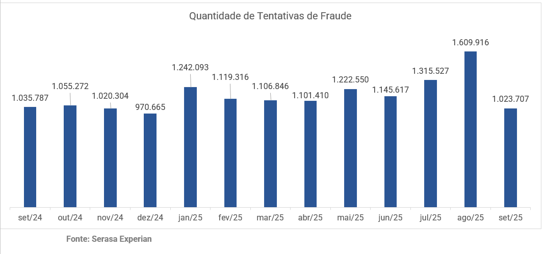 O Brasil registrou 10.886.982 tentativas de fraude no acumulado de janeiro a setembro de 2025, um aumento de 28,6% em relação ao mesmo período de 2024, com uma ocorrência a cada 2,2 segundos. Abaixo, confira o gráfico do detalhamento mês a mês das tentativas de fraude: