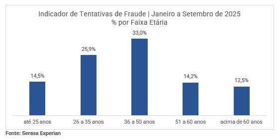 As vítimas de 26 a 50 anos concentram, em conjunto, 58,9% de todas as tentativas de fraude mapeadas no período, evidenciando que o foco dos criminosos recai justamente sobre o público em plena atividade econômica e com maior intensidade de uso dos canais digitais. Especificamente, consumidores entre 36 e 50 anos respondem por 33% das ocorrências, enquanto o grupo de 26 a 35 anos concentra 25,9%. Confira abaixo um gráfico com detalhamento da distribuição das fraudes por idade: