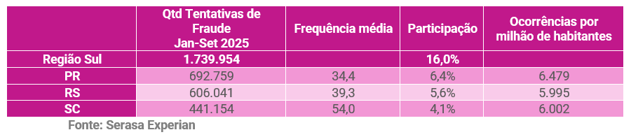 Entre os estados do Sul, o Paraná liderou em volume absoluto, com 692.759 tentativas de fraude, seguido por Rio Grande do Sul (606.041) e Santa Catarina (441.154). Já na análise proporcional à população, Santa Catarina registrou 6.002 ocorrências por milhão de habitantes, índice próximo ao observado no Rio Grande do Sul (5.995) e no Paraná (6.479), indicando elevada incidência em toda a região. A seguir, confira a tabela completa com o detalhamento dos dados por estado do Sul: